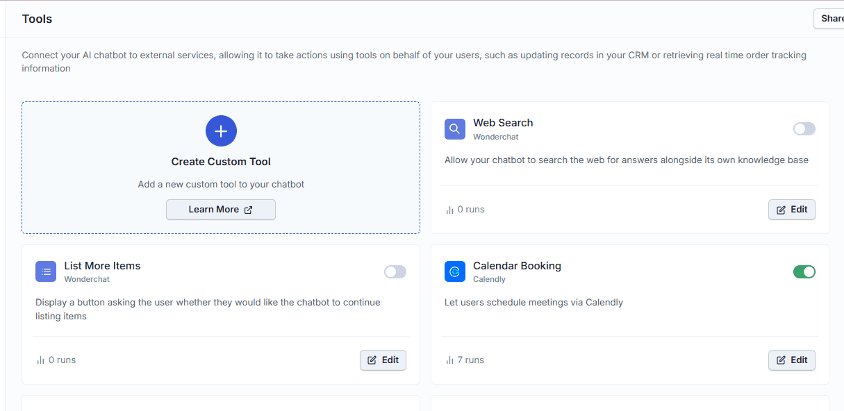 Inside your Wonderchat dashboard, navigate to Tools and locate the Calendly option. Toggle it on and the booking capability is immediately active — your chatbot can now schedule meetings on your behalf without any manual involvement.