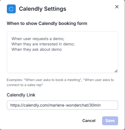 Enable Wonderchat's Calendly integration in minutes — no code required. Set a booking trigger, paste your Calendly link, and let your AI chatbot schedule meetings for you.
