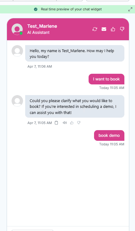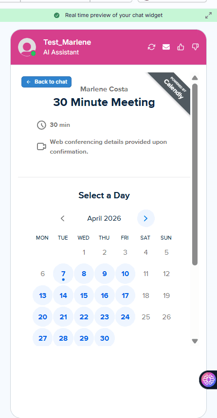 When a prospect is mid-conversation and asks "Is it possible to have a demo?", the chatbot automatically recognizes the intent and responds with the Calendly booking link. The prospect selects a date and time without ever leaving the chat. No lead leakage. No manual follow-up required.