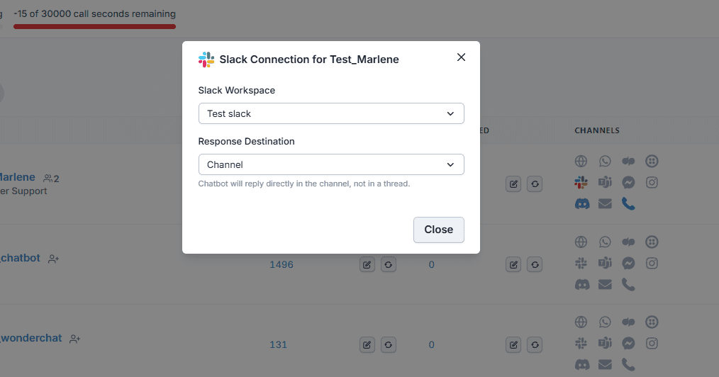 From the Chatbots page, select your chatbot and click the Slack logo. Choose your Slack workspace and set the response destination — replies can go into a thread or directly into the channel. Once saved, the Slack logo turns from gray to colorful, confirming your AI ticketing bot is live.
