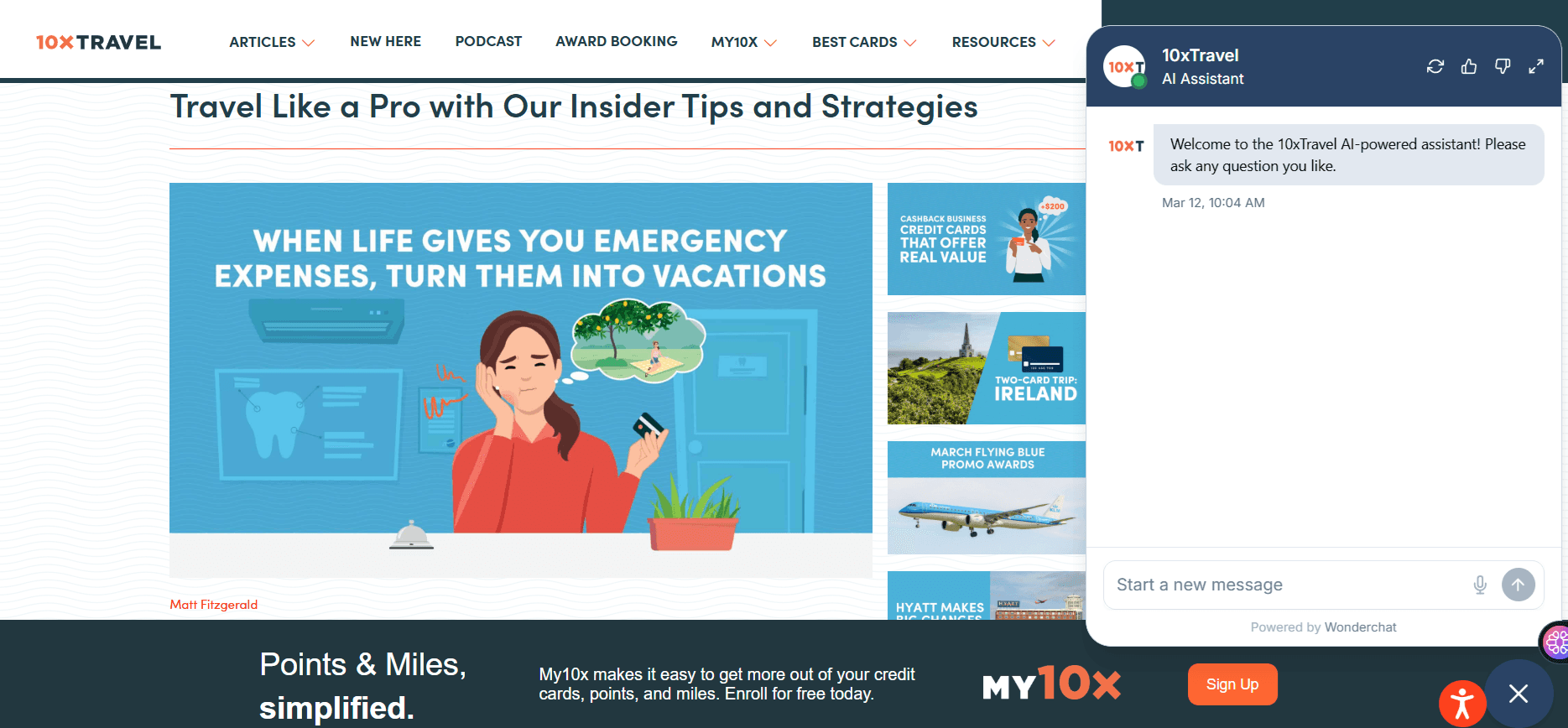 To reduce the load, 10xTravel implemented Wonderchat's AI chatbot across their help center and course platforms. Trained on the company’s content, the chatbot now handles common queries about point transfers, redemptions, and course logistics, providing accurate answers instantly without requiring human involvement.