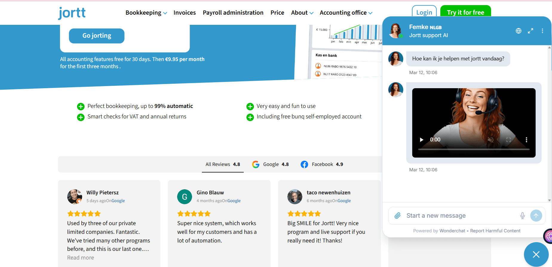 Jortt deployed their Wonderchat AI Agent (affectionately named Femke) to automate support across their online book keeping platform platform. Femke was trained on their knowledge base and now handles the majority of support queries independently on their website.