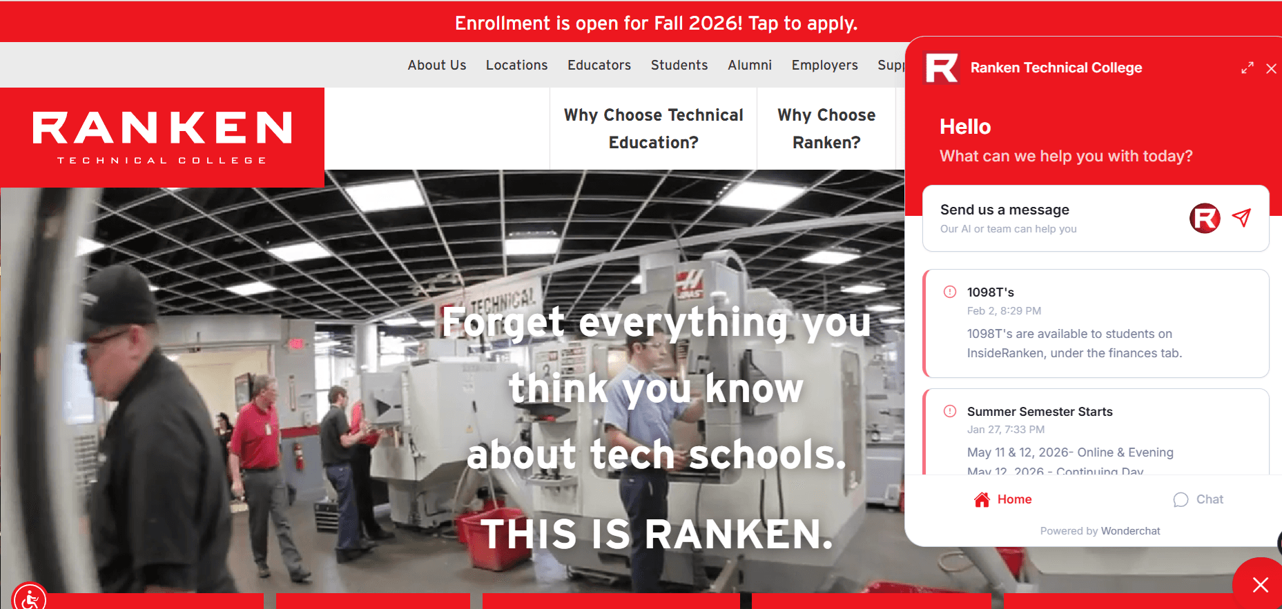 Ranken Technical College deployed an AI support agent to handle admissions and student service inquiries across chat and email. The system provides instant, policy-aligned answers using official catalog and admissions documentation.