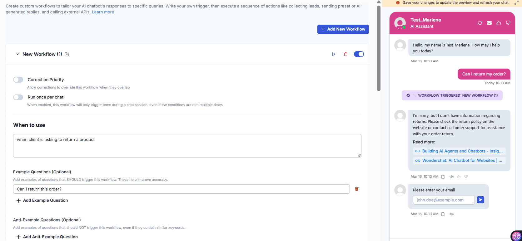 Create triggered workflows inside Wonderchat that activate when a customer expresses a specific intent, such as requesting a return. The AI walks the customer through each step sequentially, collecting all required information before any human involvement is needed.