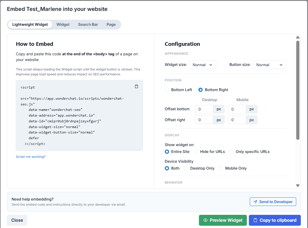 Before copying the script, customize how the chat widget appears on your Framer site. Set the widget size, screen position, and display behavior directly inside the Wonderchat embed panel — changes are reflected in the embed code automatically.