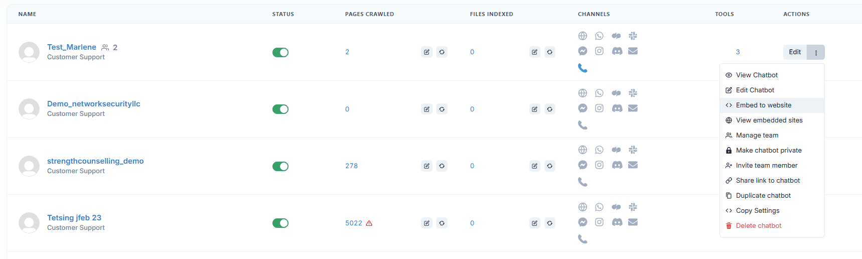 Inside Wonderchat, select your bot, open the three-dot menu, and choose Embed to Website. The embed configuration tab generates a ready-to-copy script that carries all your bot's settings — no manual configuration required on the Framer side.