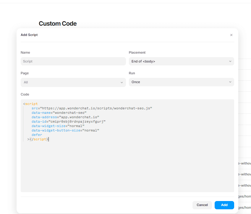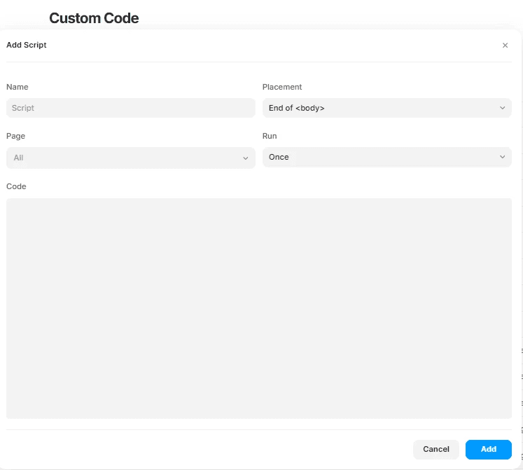 Copy the embed code to your clipboard and paste it into the Custom Code section inside Framer Settings. Give the script a recognizable name and select whether it runs in the page head or body — then save to lock it in.
