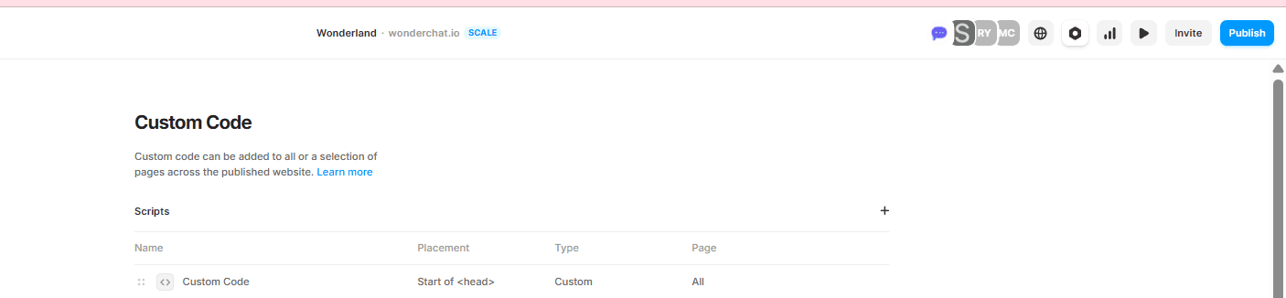 Navigate to the three-dot menu in your Framer project, go to Settings, then select Custom Code. This is where Framer allows you to inject external scripts — the exact entry point for embedding your Wonderchat AI agent onto your site.