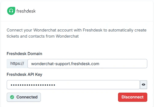 From the Wonderchat dashboard, go to Settings then Integrations, find Freshdesk, paste your domain and API key, and click Connect. No developer resources needed. The integration confirms immediately and your chatbot is ready to create tickets in Freshdesk.