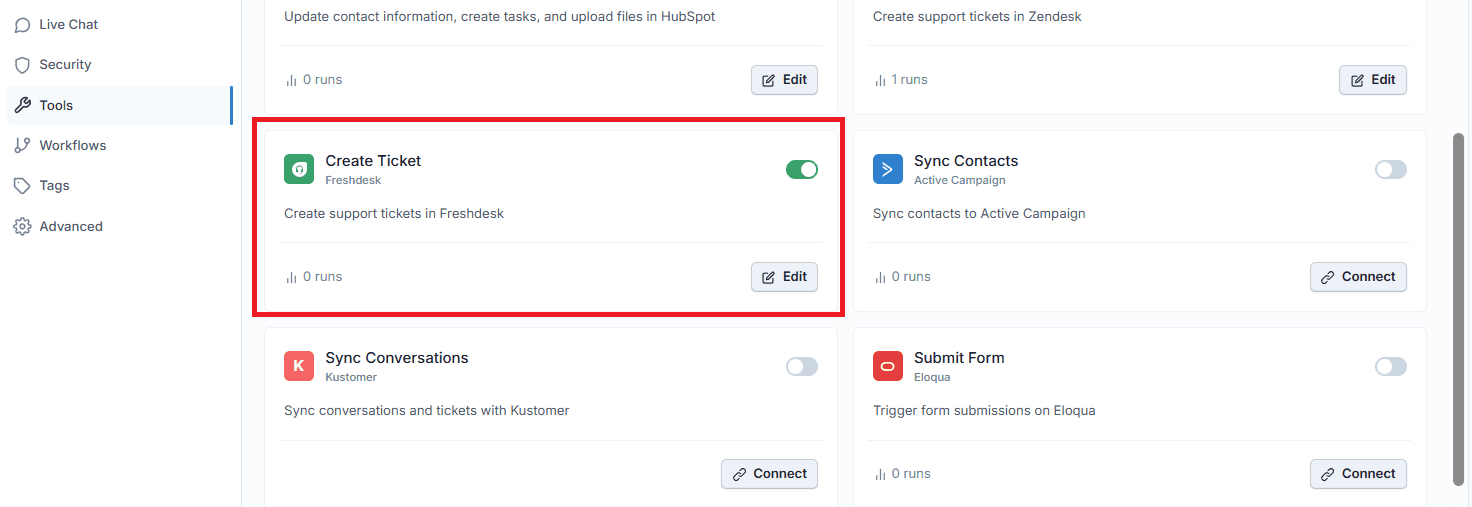Once connected, enable ticket creation inside your chatbot's Tools settings. Wonderchat creates structured Freshdesk tickets on your behalf whenever the AI determines a conversation needs human follow-up, keeping your helpdesk organized without manual effort.