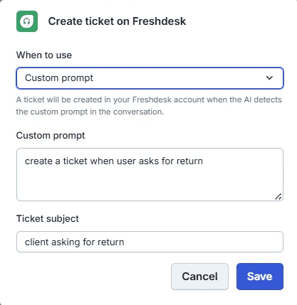 Define custom prompts that control exactly when a Freshdesk ticket is created. For example, set a rule like 'create a ticket when the user asks about a return.' Wonderchat follows your logic precisely, so tickets are created with intent and context, not noise.