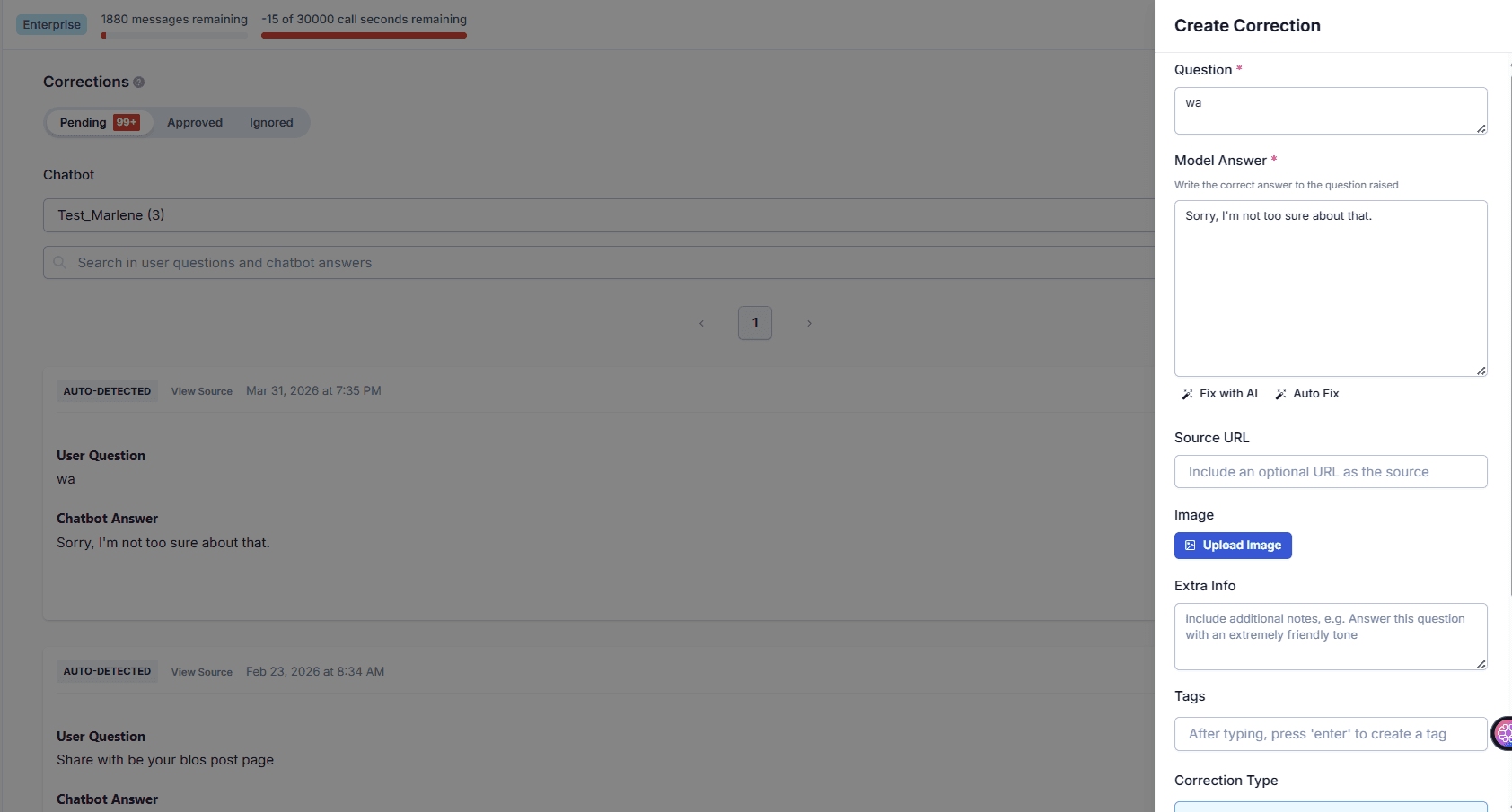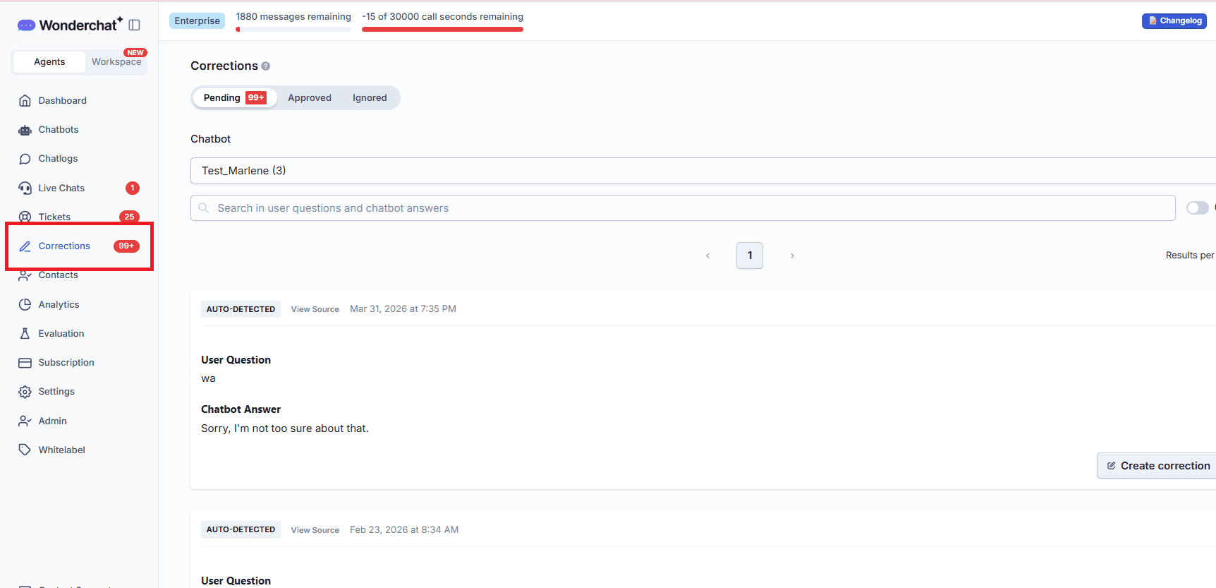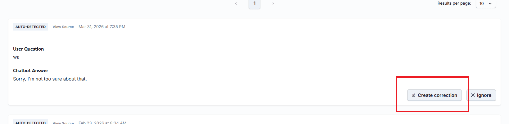 The Corrections section inside the chatbot editor automatically collects every conversation where the bot was not fully confident in its reply — including cases where it said "I'm sorry, I'm not sure." No manual log-digging required. Every gap surfaces in one dashboard.