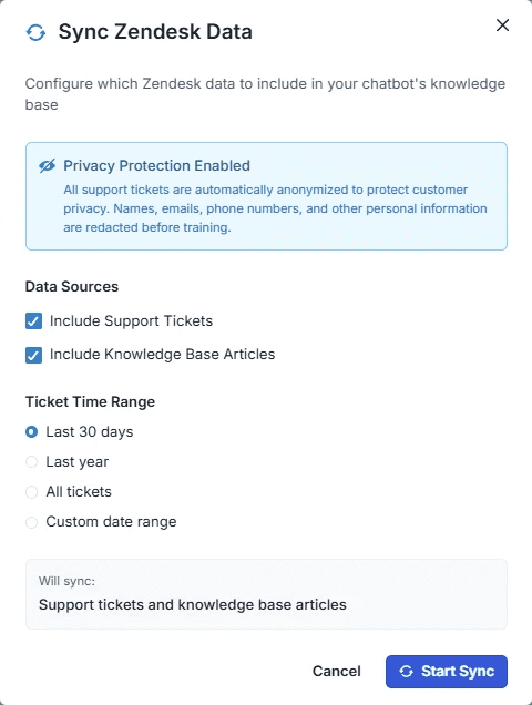 Sync updated Zendesk content back into your chatbot