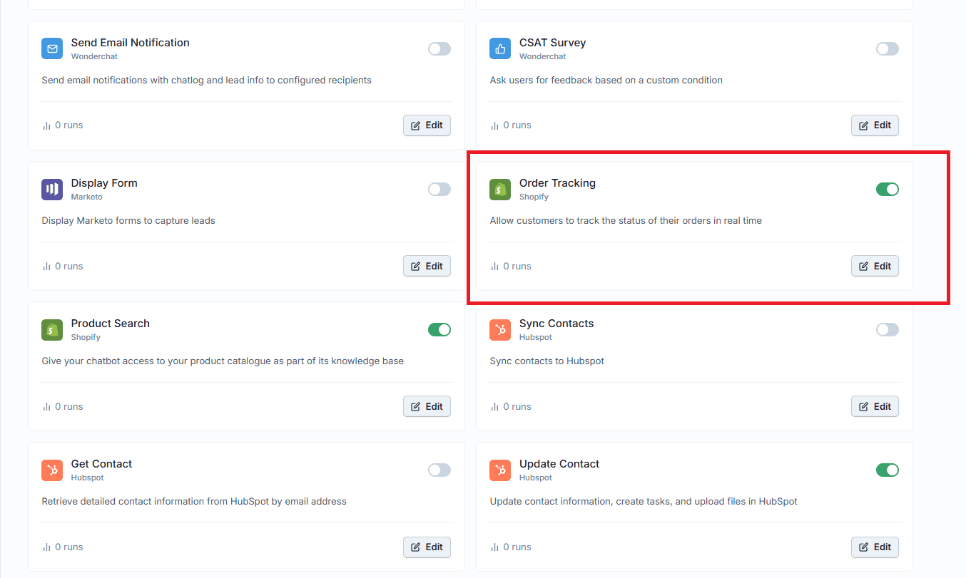 Once connected, enable the Order Tracking tool inside your chatbot's Tools section. Customers can check their order status directly in the chat widget using their order number, email, or both. Your AI agent pulls live data from Shopify and responds instantly.