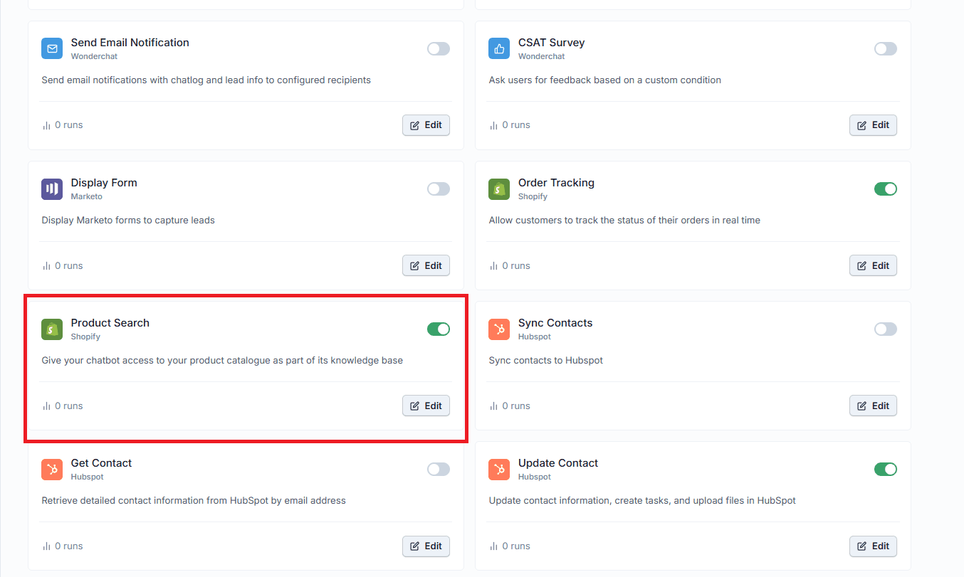 Enable the Product Search tool to sync your entire Shopify product catalog as the chatbot's knowledge base. Your AI agent can answer detailed product questions, help customers discover the right item, and support purchase decisions without leaving the chat.