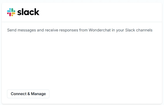 From the Wonderchat admin dashboard, navigate to Settings then Integrations and locate the Slack tile. Click "Connect and Manage" and a new tab opens with a prompt to connect your Slack workspace. No code, no API keys, no developer involvement.