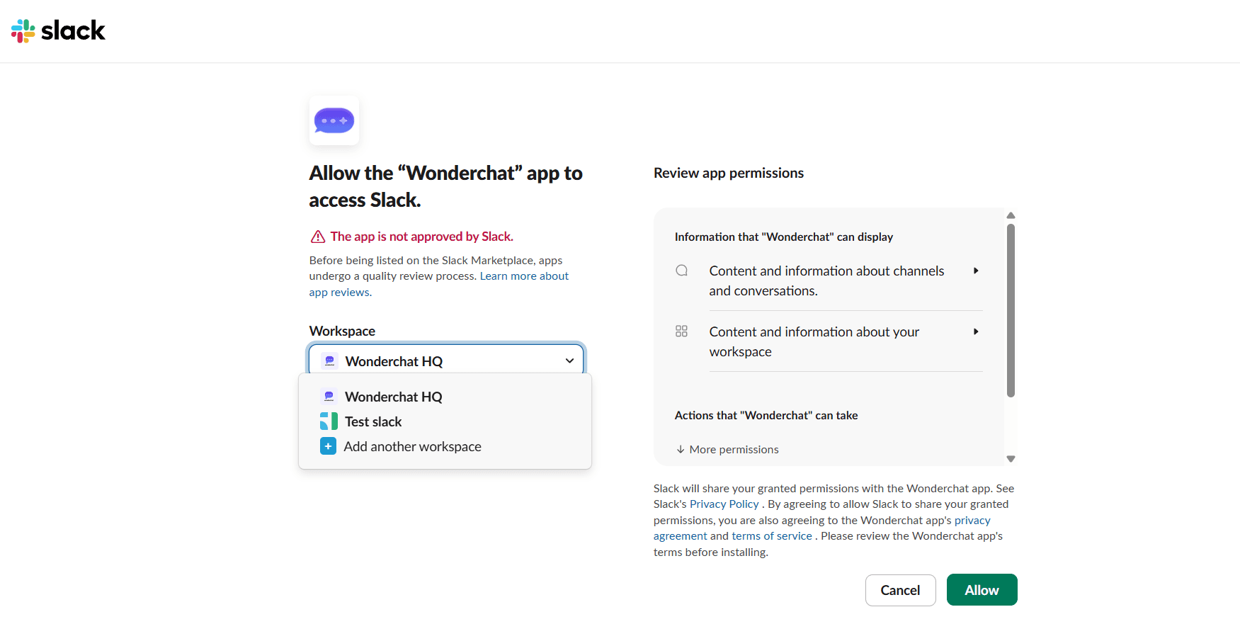 Slack's standard OAuth authorization page opens in your browser. Select your workspace from the dropdown, review the app permissions, and click Allow. You are redirected straight back to Wonderchat. Familiar, secure, and complete without any developer setup.