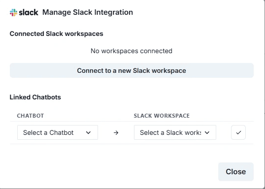 After authorization, return to Settings then Integrations then Slack and click "Connect and Manage" again. Your connected workspace now appears. Select which Wonderchat AI agent to link to that workspace and confirm with a checkmark. Multiple agents and multiple workspaces are fully supported.